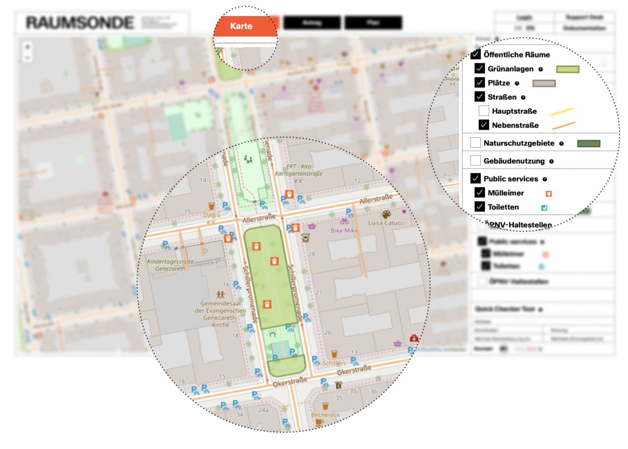 Die Raumkarte von Raumsonde hilft dir dabei, einen passenden Ort für deine Veranstaltung zu finden. Über die Kartenebenen kannst du sehen, ob sich deine Veranstaltung in Bereichen befindet, für die besondere Genehmigungen erforderlich sind, z. B. Grünflächen oder öffentliche Straßen.