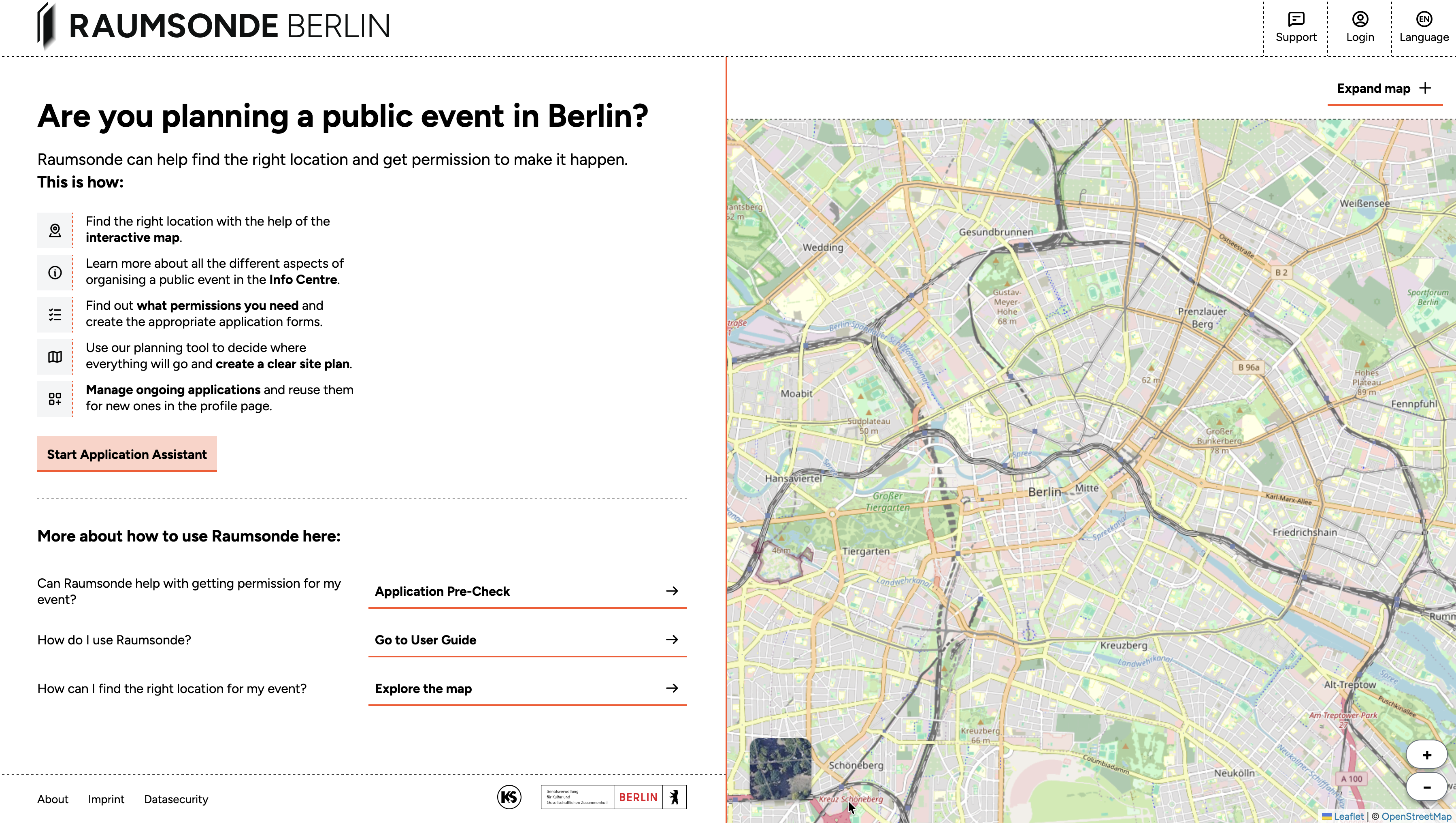 The tool helps you investigate potential locations, draw a scaled site plan for your event, work out which permits you are likely to need, and prepare the associated application documents. For certain permits, Raumsonde can generate application forms and supporting documents directly. For others, it provides links to the relevant online services and the responsible authorities.