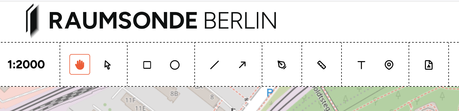 You can zoom in and out to adjust the level of detail, and set the precise scale of the view using the numerical input on the left side of the header bar. When you select a drawing tool, a square frame appears on the map showing the boundaries of the final plan. Set your scale so that all elements of your event and any relevant context (roads, buildings, etc.) fall within this frame.