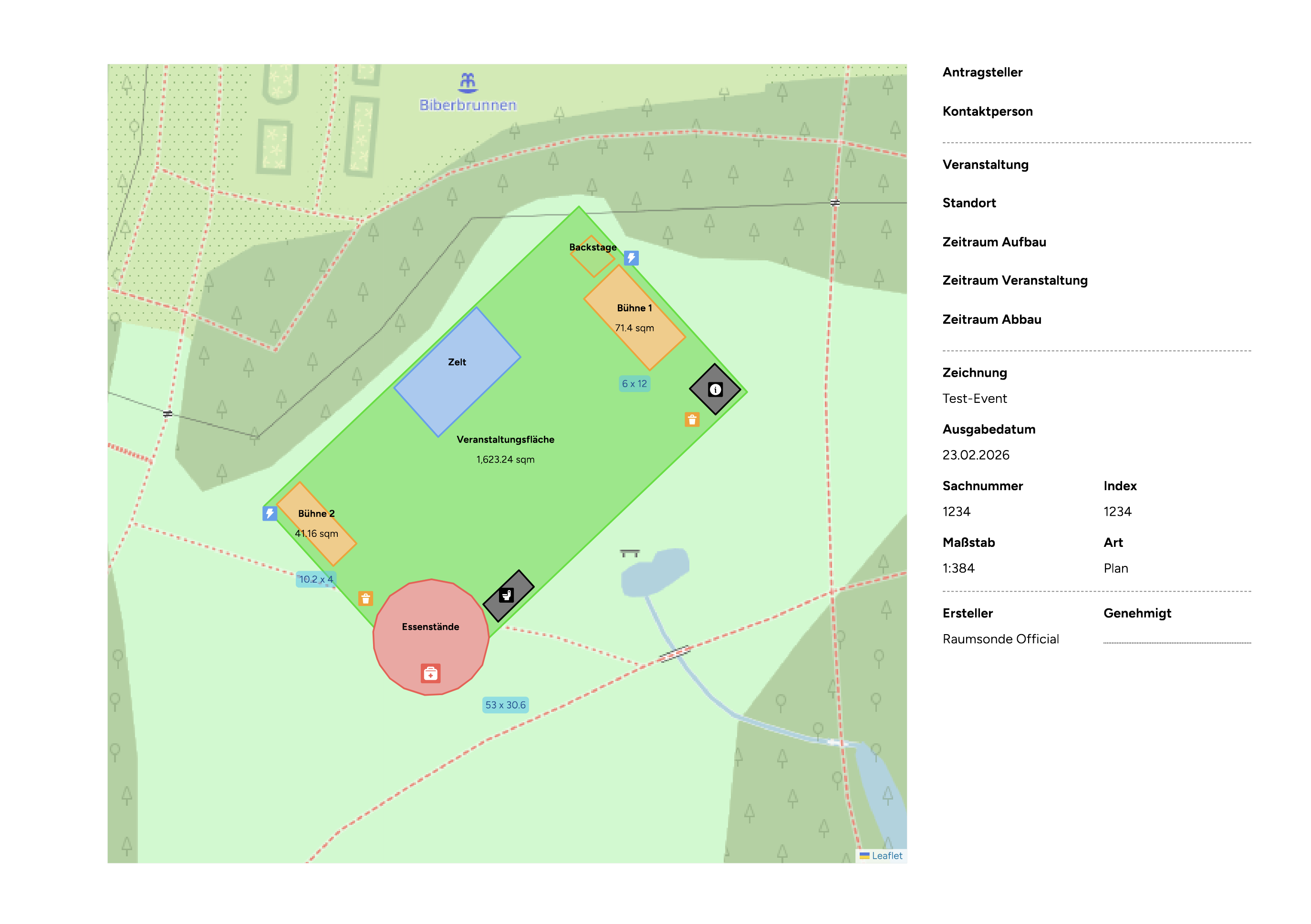 A site plan is a scaled drawing showing the layout of your event on the chosen location. It indicates the position of all key elements – such as stages, seating areas, fencing, entrances, escape routes, catering areas, toilets, technical equipment, and electricity connections – drawn to scale on a map of the site.