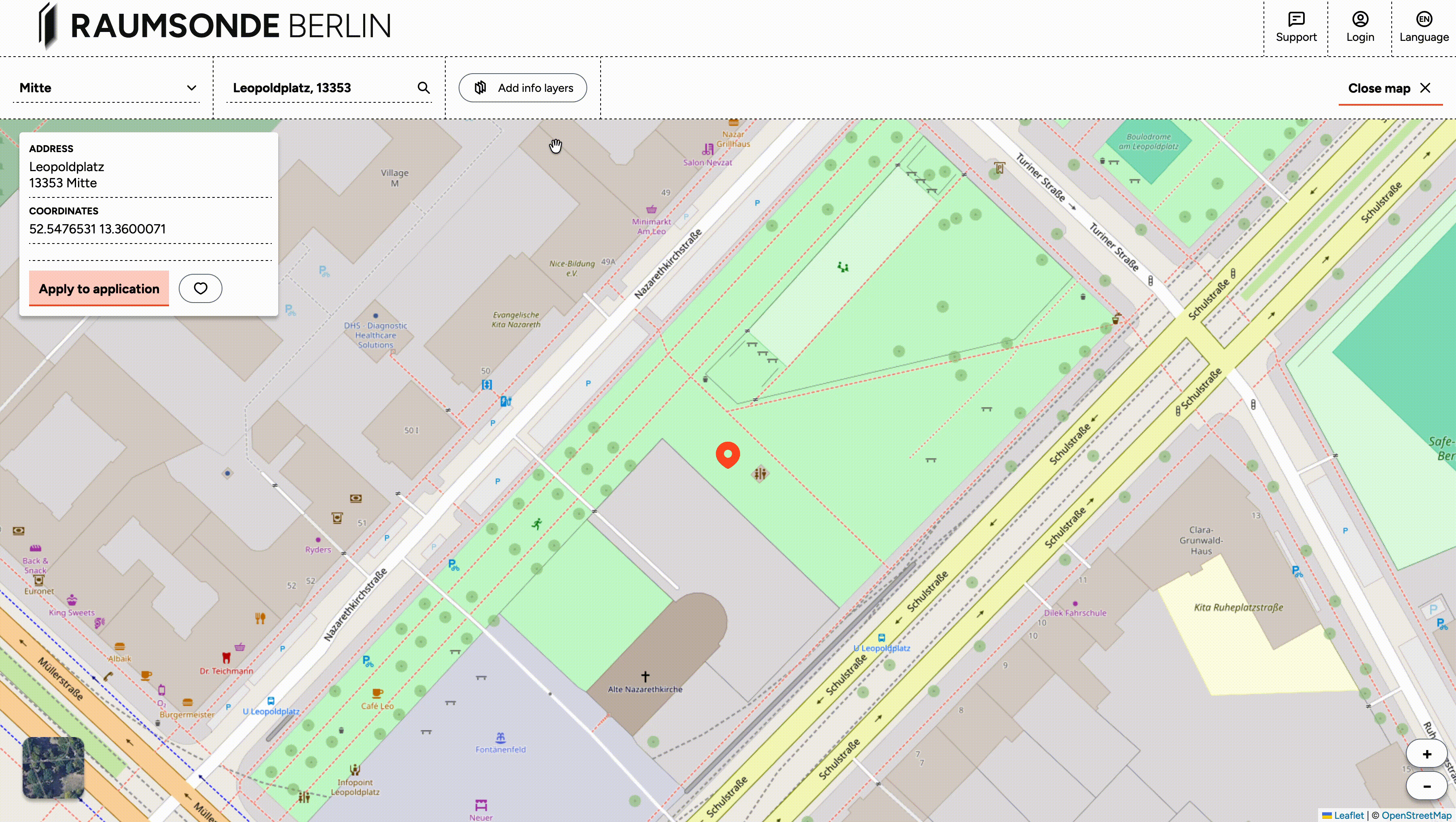 The Quick Checker displays several data points to help you assess the suitability of the selected site at a glance – for example, the type of space, proximity to sensitive locations, and the responsible district office (Bezirksamt). This is a useful starting point before investing time in a full application. If a location has characteristics that may make a permit difficult to obtain, the Quick Checker can help you identify this early. To close the Quick Checker and remove the selected point from the map, simply click on the point again.