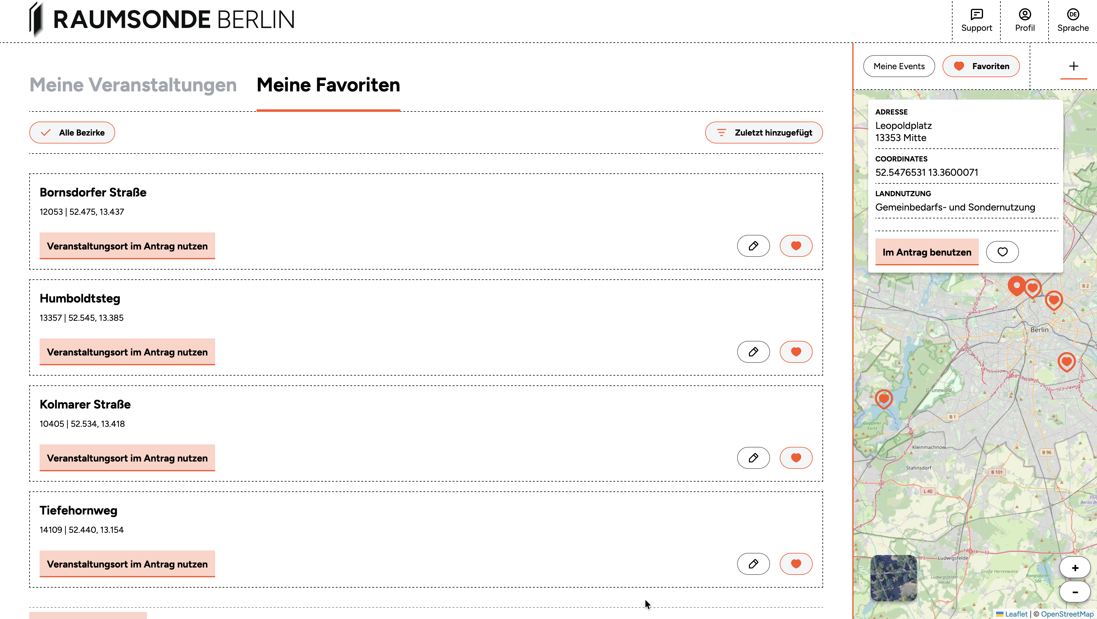 If you are logged in and have set up events through Raumsonde, you can display their locations on the Space Map by toggling on the My Events button in the map header bar. This gives you a quick visual overview of where your past, current, and upcoming events are located across the city.