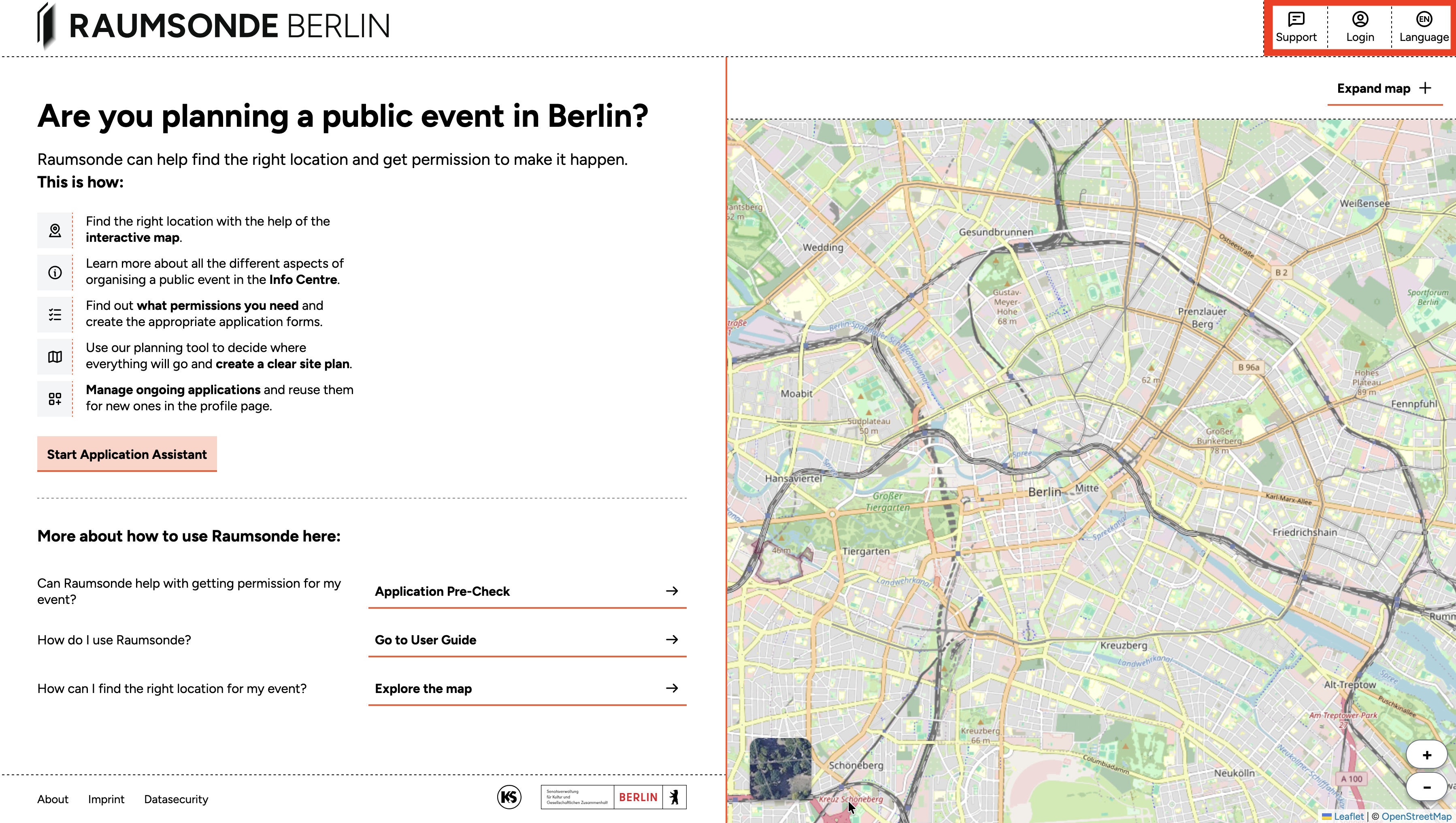 The information column (left) is the main text-based area of the site. At the top, a short introduction explains what Raumsonde can do, followed by a summary of the tool's key features. Below this, the Start Application Assistant button takes you directly into the application process.