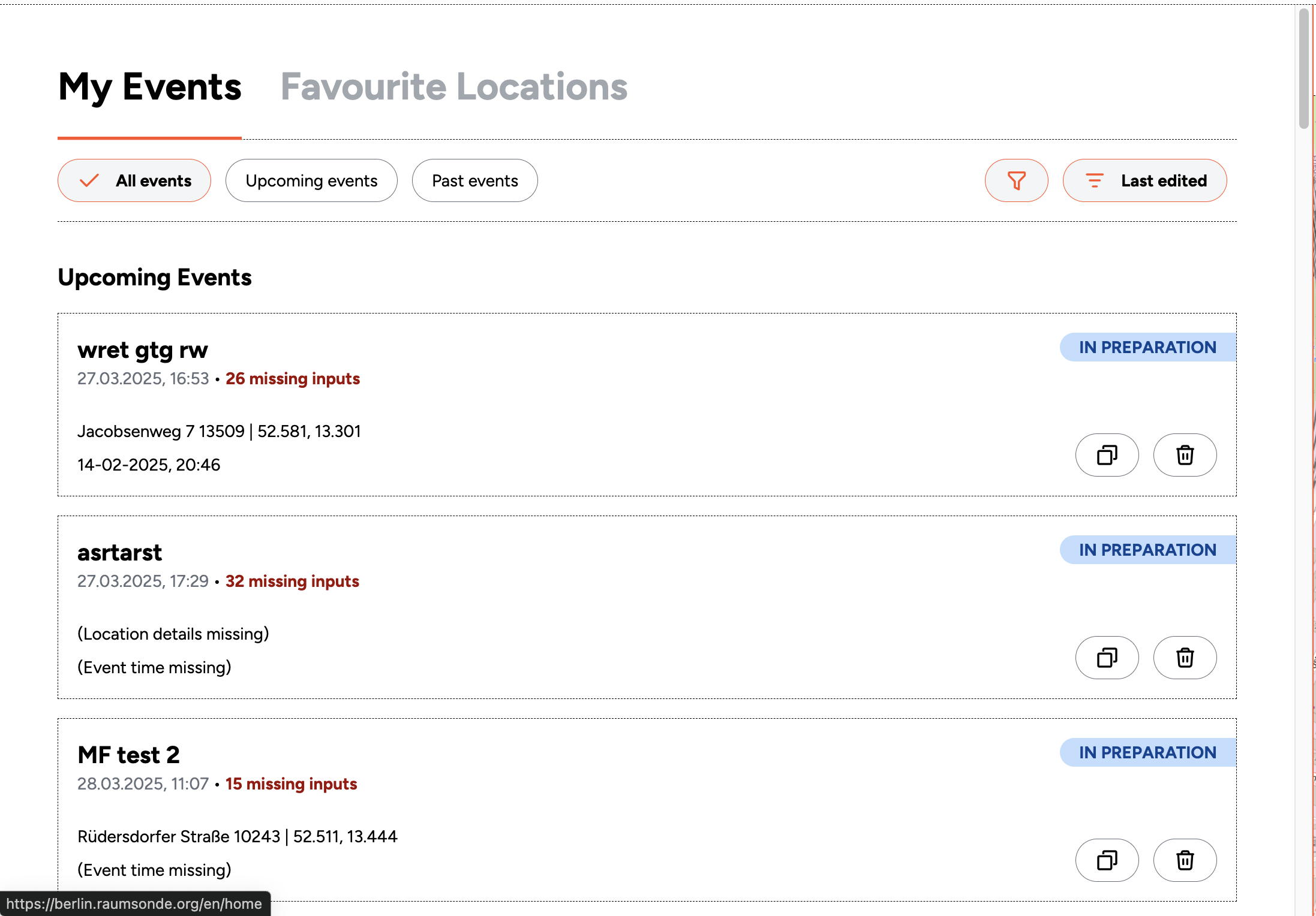 The My Events section lists all the events you have set up through Raumsonde – past, present, and future. You can open any event to view its Application Dashboard, continue preparing applications, adjust details, or update permit statuses.