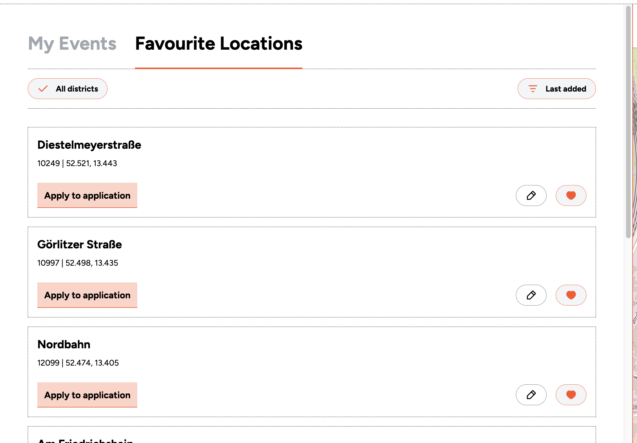 The My Favourite Locations section shows all the locations you have saved on the map of Berlin. You can browse your favourites to find a suitable site for the event you are planning.