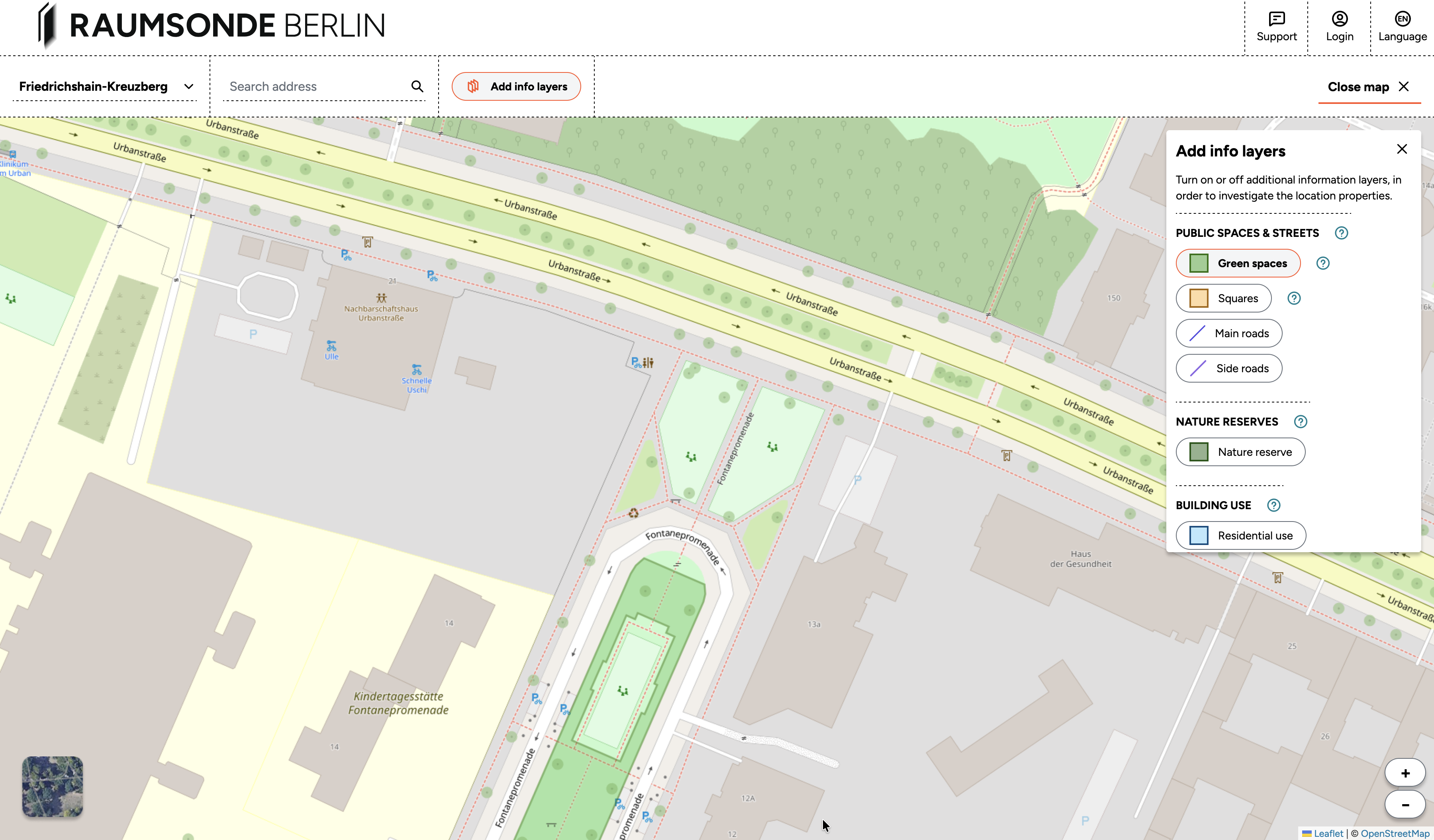If your event takes place on green surfaces near streets that are not officially designated as green spaces–like the front part of Fontanepromenade shown here–it can be sensible to also consult the Public Green Spaces guide. There you will find hints on how public green spaces can be protected.